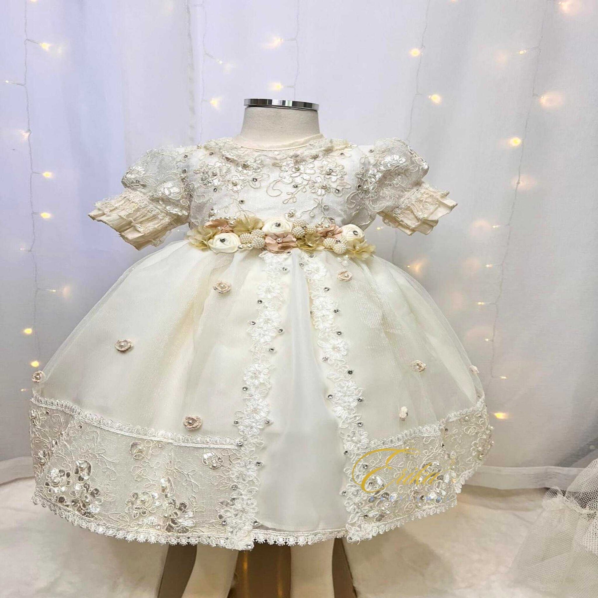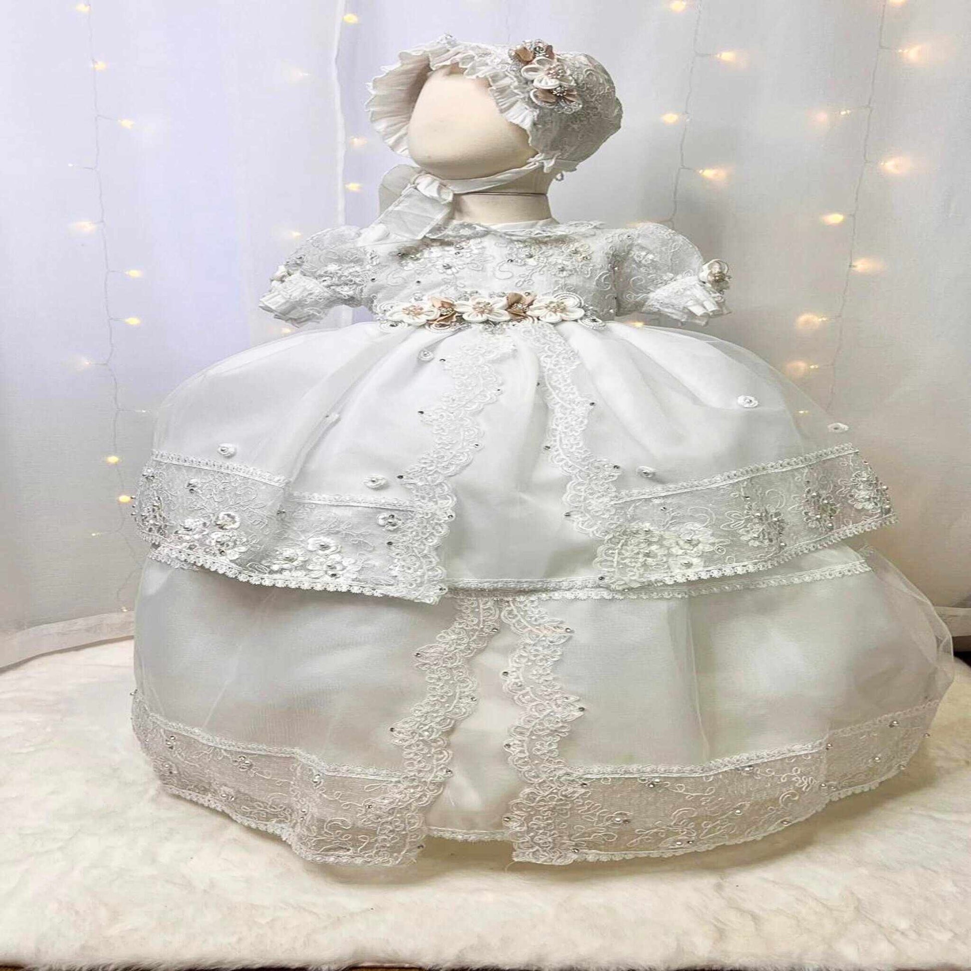 The Chayo Christening Gown is a classic baptism dress designed with delicate lace, intricate embroidery, and fine handcrafted details that reflect timeless elegance. Its voluminous skirt and soft inner lining provide both grace and comfort, perfect for your baby’s special day.