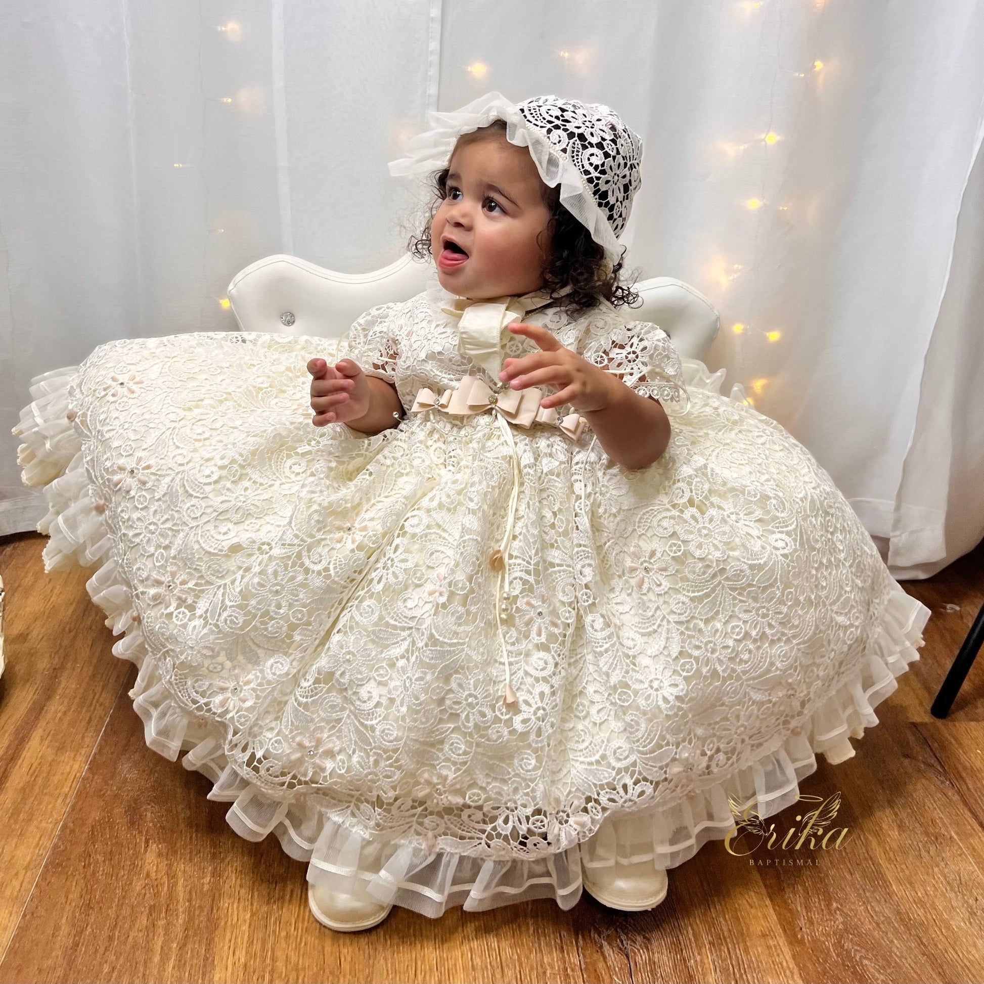Cindy Baptism Short Dress is a charming pearl-tone baptism dress designed to look elegant and sweet in every photo. Featuring delicate lace details and a full, classic silhouette, it’s made for comfort while keeping a formal, special-occasion look.