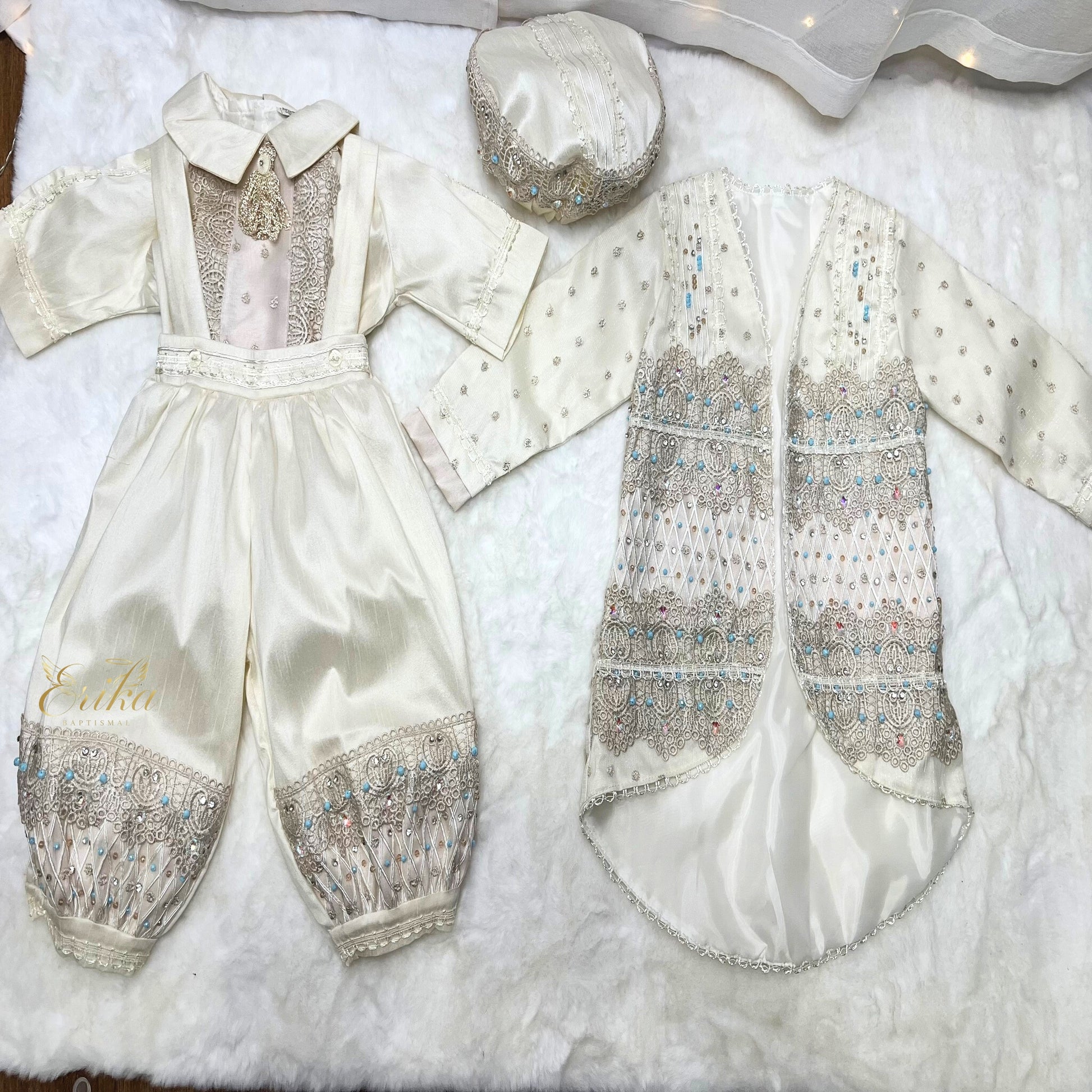 This ensemble includes a traditional romper with an embroidered vest-style overlay and a matching cap—perfect for baptisms, christenings, and other special formal occasions.