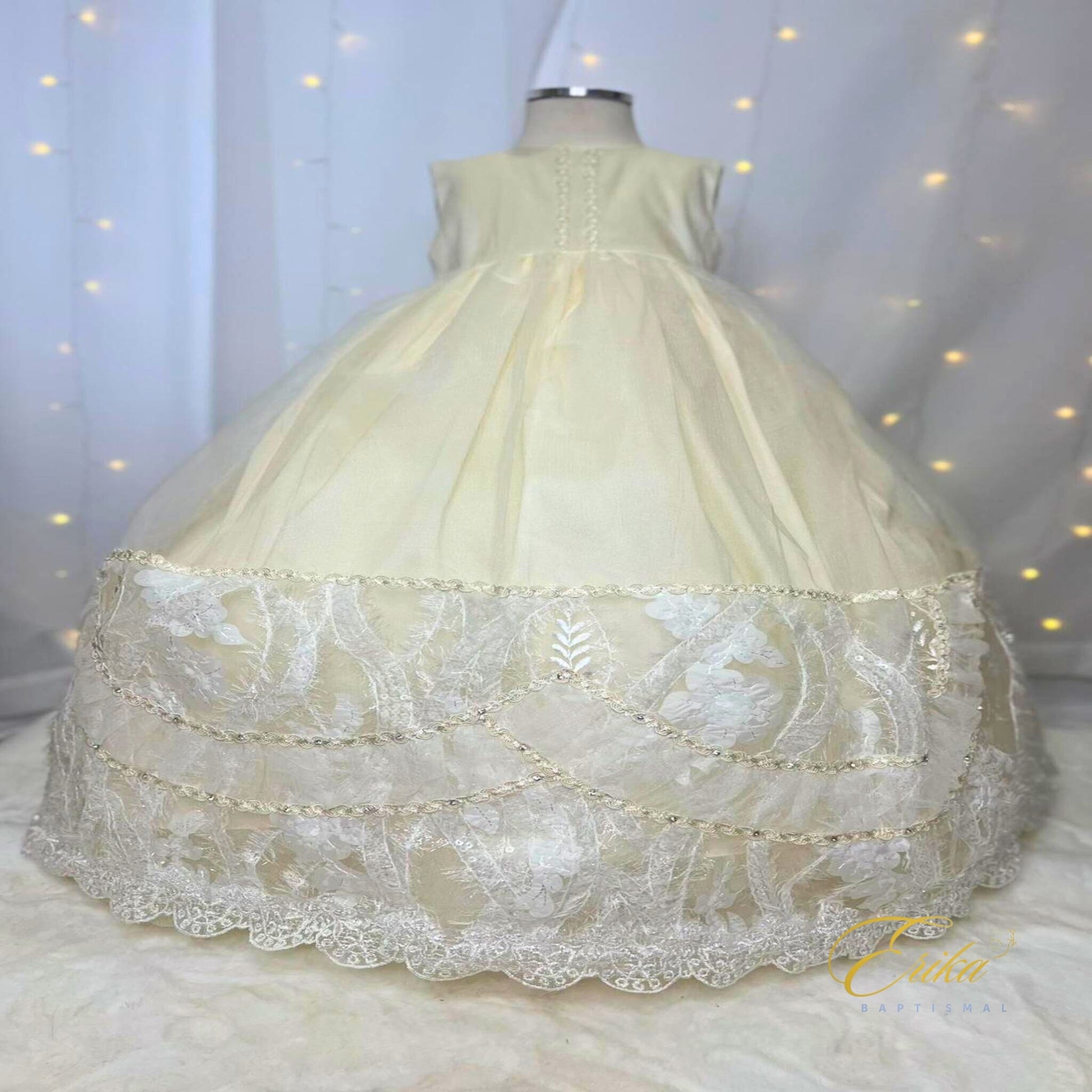 Graceful ivory christening gown for baby girls, featuring a full embroidered lace skirt with shimmering details and a romantic bonnet – perfect for baptisms, blessings, and timeless heirloom photos. 🕊️