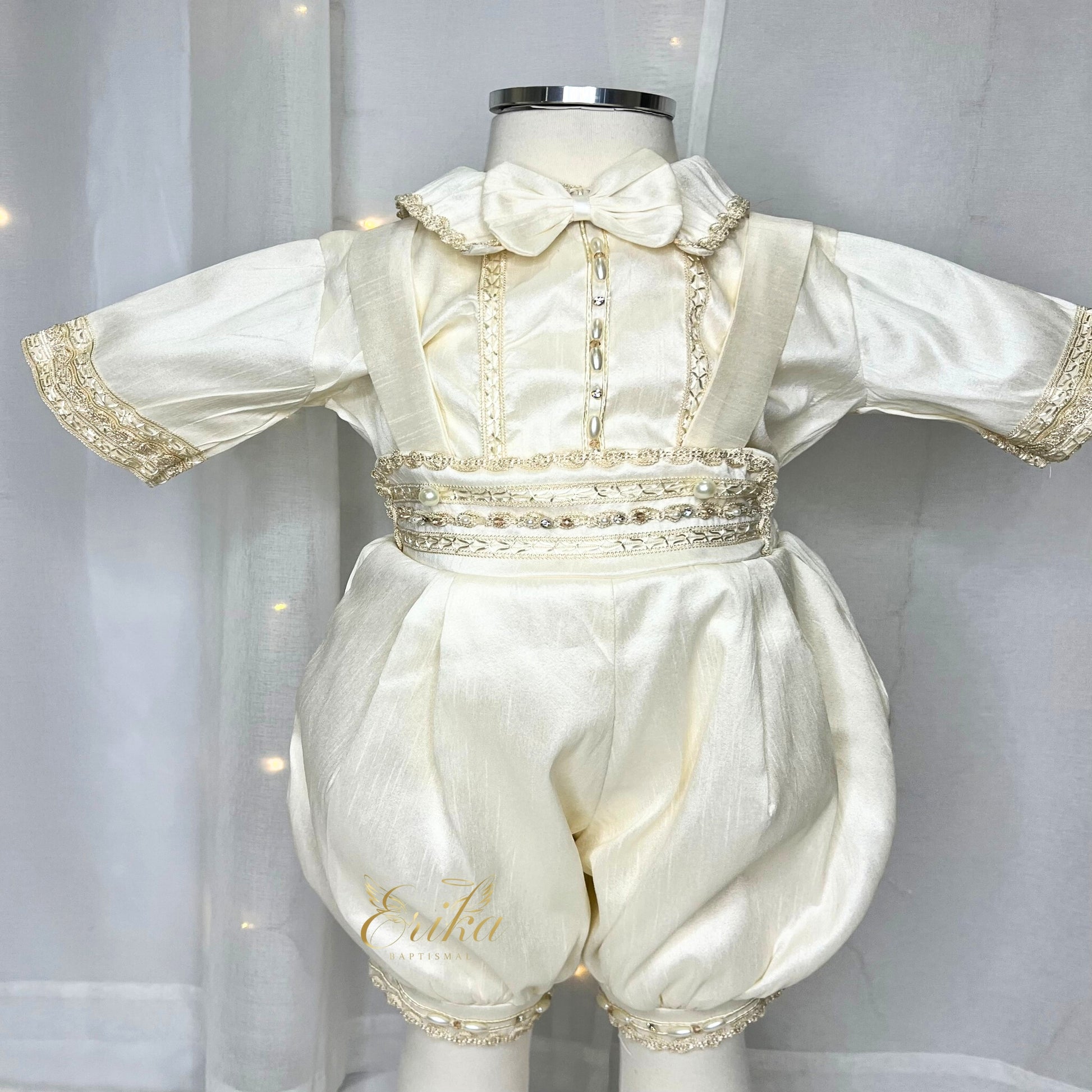 Galindo Baptism Suit is a handcrafted baby boy baptism outfit designed in a traditional European ceremony style. Made with soft premium fabric and elegant embroidered details, it creates a timeless look while keeping your baby comfortable on his special day.
