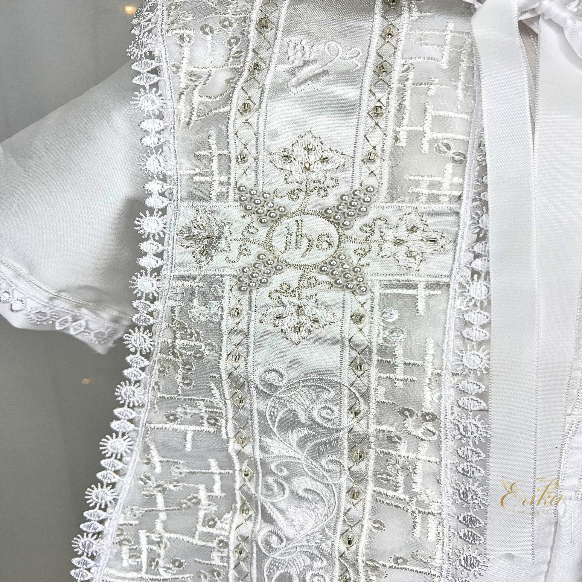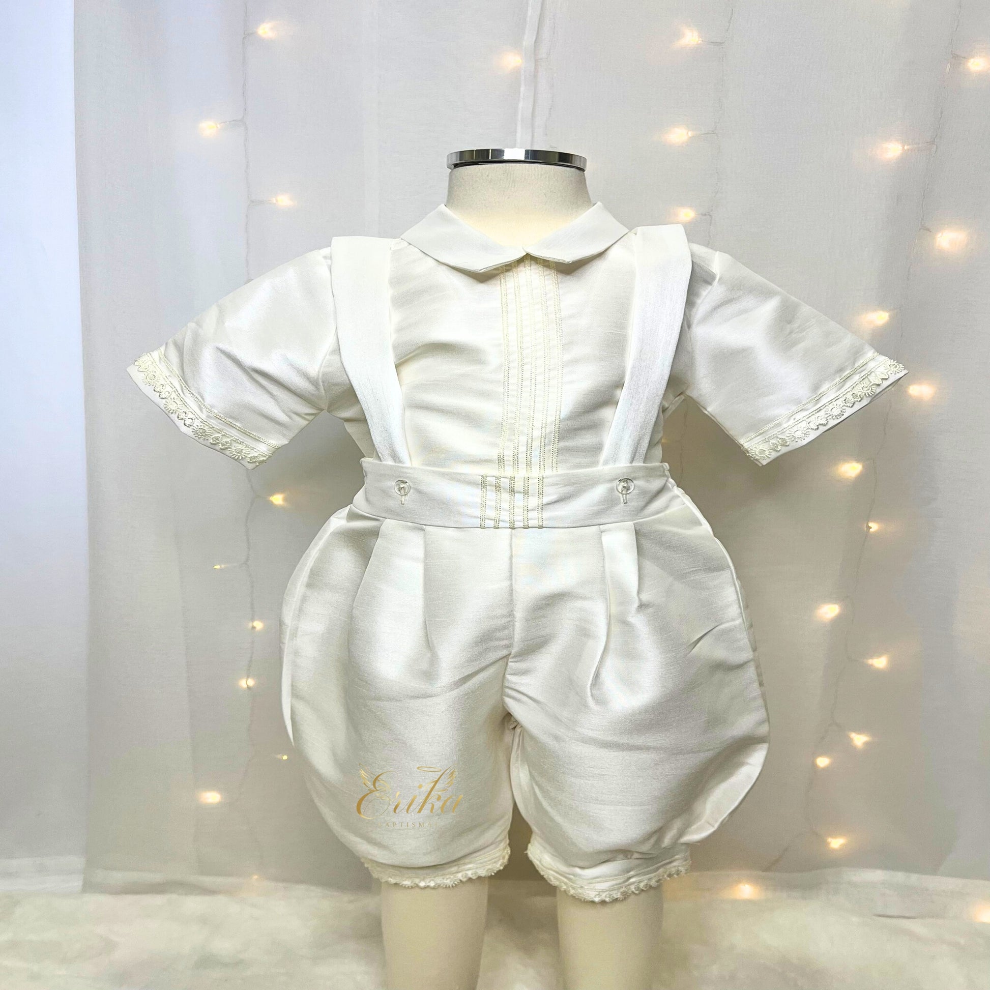 Mateo Baptism Suit is a classic baby boy baptism outfit designed for a clean and timeless ceremony look. Made in crisp white with delicate lace detailing, it offers comfort and elegance for your child’s special day.