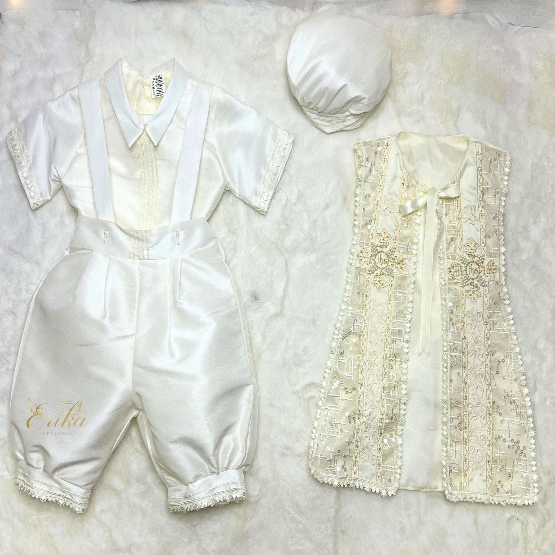 This set features a traditional romper with a lace vest-style overlay and a matching cap—ideal for baptisms, christenings, and formal celebrations.