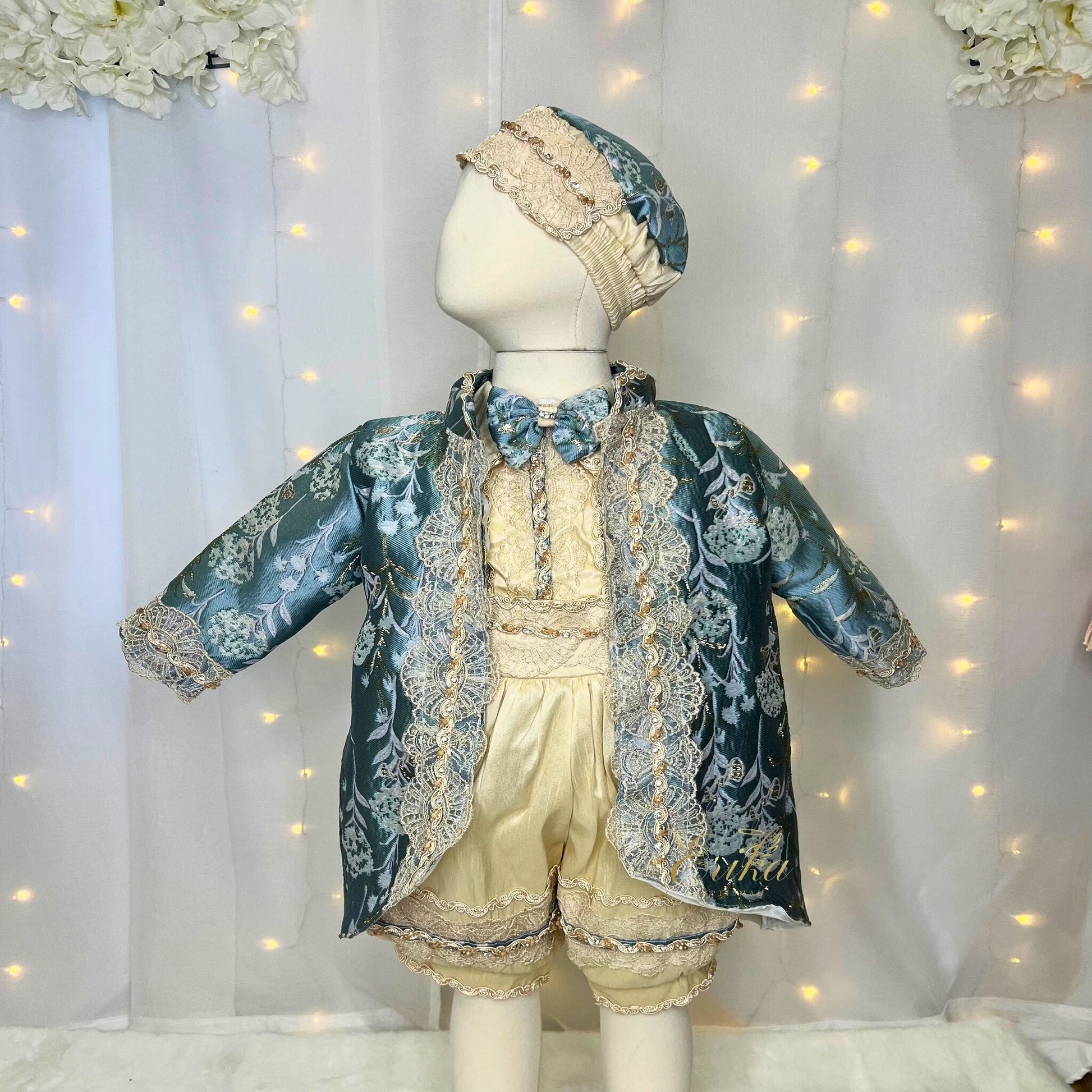 Nico Baptism Suit is a handmade baby boy baptism outfit inspired by classic Spanish ceremonial style. Crafted with premium fabric, brocade textures, and delicate lace details, it offers a timeless and refined look for your baby’s special day.