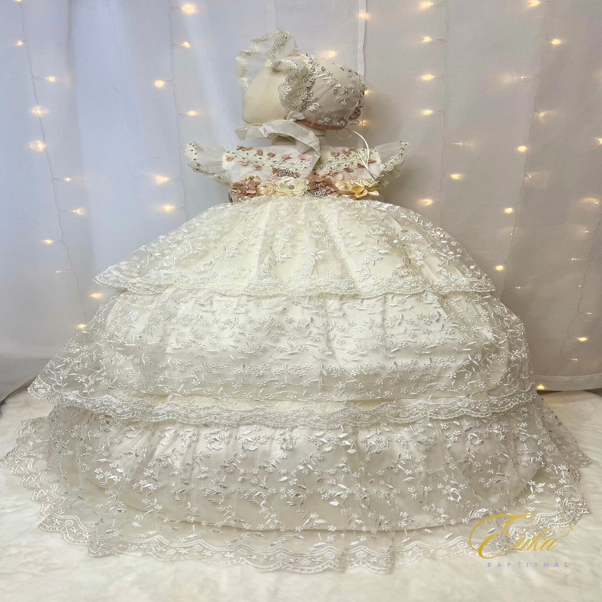 Graceful ivory christening gown for baby girls, featuring a full embroidered lace skirt with shimmering details and a romantic bonnet – perfect for baptisms, blessings, and timeless heirloom photos. 🕊️